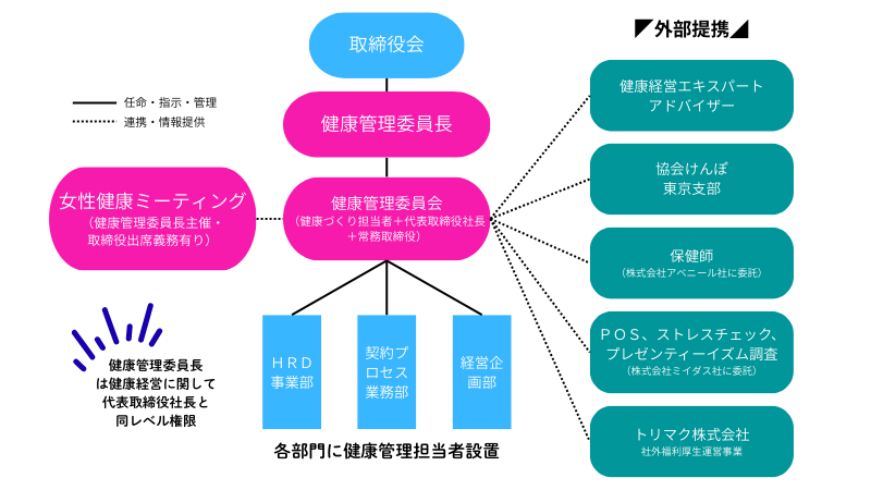 女性健康ミーティング※ | 年3回+定期健康診断前MTGを実施、特に定期健康診断前のミーティングは経営者も関与し開催 |